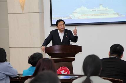 杨国兵先生以“我和我的邮轮梦”为主题向在座师生回顾了自己从事邮轮相关行业的工作经历。怀揣着无限希望与使命担当,五年多的时间里,他带领中船集团一路拼搏奋斗,实现国产大型邮轮的制造与突破,拥有一套较为完整的邮轮工业体系和生态系统。他提到,中船集团坚定贯彻“引进消化吸收再创新”的研发模式,构建了以邮轮内装为核心的供应链体系,探索了从合资合作到独立自主的邮轮运营道路,在加强国际合作的同时,强化自身人才储备与自主研发能力,始终将主动权牢牢握紧在自己手中。同时,国产邮轮生产制造与运营上仍存在不足,提高本土化率任重而道远。伴随着国产大型邮轮劈波斩浪,驶向世界,杨董的“邮轮梦”也逐渐清晰,即“中国将在未来完全自主打造邮轮运营本土品牌”,谈及此他无比自信,豪情万丈,与会同学无不被这种激情感动,掌声不断。