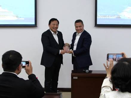 分享会上,史健勇教授向杨国兵董事长的到来表示热烈的欢迎。他指出,国产大邮轮的顺利交付并投入商业运营,是继大型液化天然气运输船、航空母舰后,我国又一次突破技术,成功摘取造船工业的最后一颗“闪耀的明珠”,这意味着我国造船工业再次迎来新机遇。如今,乘坐我们自己设计制造的邮轮航向世界已经成为现实,这背后,承载了无数邮轮人的辛勤耕耘与殷切期待。希望同学们能够学习杨国先生对邮轮事业执着的追求与远大的梦想,将邮轮梦发扬传递下去,从“我的梦”变成“我们的梦”。随后,史健勇教授也代表公司,向杨国兵先生赠送了企业家导师的奖牌。
