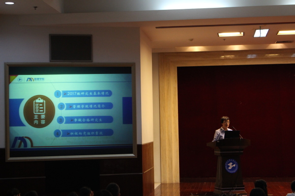 2015级企业管理专业陈思静同学作为高年级研究生代表, 向学弟学妹们分享了关于如何度过研究生生活的感悟和建议。并提醒大家学会感恩,珍惜生活,珍惜师生情、同窗情。