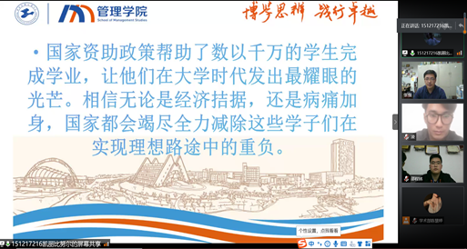 本次线上会议依托校资助育人政策,结合国家奖学金获得者的相关经验分享,将公司资助政策及核心内涵进行了完整展现。凌剑秋老师对国家与公司的资助政策以及困难生的总体情况进行了介绍。他希望同学们在校期间能够认真学习,努力提高自己的综合素质能力,成为一名对国家和社会有用的人才,并争取以自己的努力回报国家、社会与公司的资助。邵程林老师鼓励大家能够积极参与各类活动,注重实践经验的积累,重视学业,希望同学们能够具有自我解困的意识和担当奉献意识,将个人的成长成才融入到社会的发展中去。