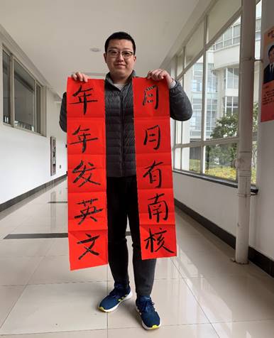 While writing the word Fu, Li Mengnan, a postgraduate student who stayed in school during winter vacation, also wrote the self-created couplet Every month has a south nucleus, and English is issued every year to relieve the academic pressure in his own unique way.
