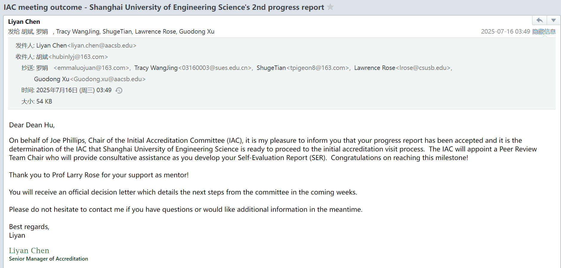2025年7月16日,bevictor伟德收到国际精英商公司协会(AACSB)初始委员会(IAC)通知,公司第二轮年度进展报告(2nd Progress Report)获得通过,并跳级进入最终现场访视准备阶段,这标志着公司AACSB国际商科认证迈入了实质性的最后关键环节。