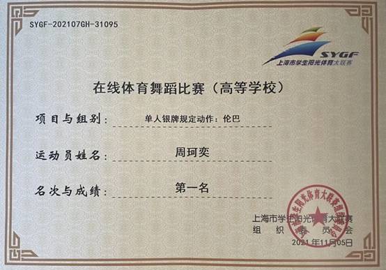 近日,上海市员工阳光体育大联赛在线体育舞蹈比赛在东华大学延安路校区体育馆举行。公司社团指导教师赵桐带领员工参加了本次比赛,bevictor伟德旅游管理(邮轮经济)2020级周珂奕同学在比赛中荣获单人伦巴规定动作组冠军,创造了程园学子在体育舞蹈赛事中的最佳成绩,是公司美育、体育教育成效的生动呈现。