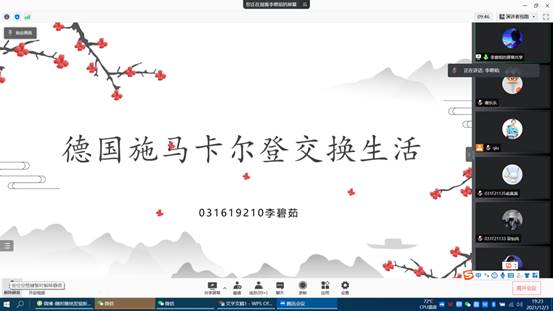 邱经理首先对来公司及公司的整体海外学习项目情况进行了简要介绍。随后,公司邀请了参加2021年海外交流学习项目的6位同学分享了他们的海外、线上学习经历和感想。聂艳菲同学介绍了《瑞典哈姆斯塔德大学交换研究生的学习生活》、李碧茹同学分享了《德国施马尔登交换生活》、何怡同学介绍了《在线上多伦多大学的一个月》、孙佳钰同学分享《线上海外交流项目给我带来了什么?——美国加州大学圣巴巴拉分校项目有感》、张政和杨南同学共同介绍了《瑞典哈姆斯塔德交换生活》。同学们分享完之后,谢妍曦老师就即将启动的2022年海外交流项目申请时间及流程、涉及的各类项目情况已经专项资金申请流程进行了较为全面地介绍。