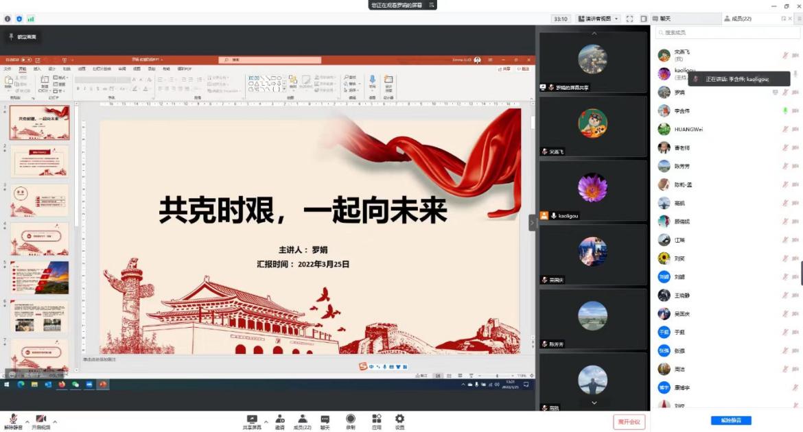会议中,各支部书记带领全体支部党员认真学习讲话精神,并通过交流分享身边人身边事,号召全体支部党员积极响应号召,越是特殊时期,越要扛起特殊责任、做出特殊担当,无论在社区或在公司,为疫情防控履职尽责,主动担当,在准封闭阶段的校园管理、疫情排查、小区封控、同学服务等工作中当先锋、作表率。同时,主动关心身边同学,倾听大家的心声,正面引导员工,在自己树立必胜的信心和决心的同时,努力营造众志成城、守望相助的浓厚氛围。