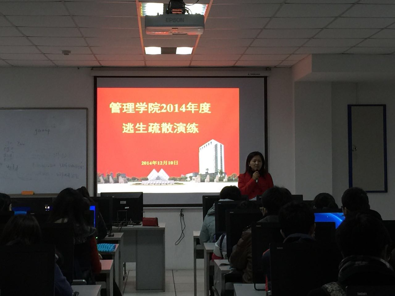 此次逃生疏散演练分为3个环节。首先,党委副书记范君晖老师向同学们介绍了如何具备逃生疏散演练的能力,逃生疏散演练的注意事项及必要性。随后,工作人员拉响警报器,模拟失火场景,引导同学们安全逃出,同学们从实验室出发,用毛巾捂口,有秩序地从楼梯一侧的消防通道下楼,全部有组织地走出实训楼。