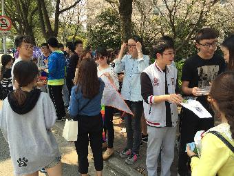 活动的另一个亮点是一只只由同学们亲手绘制的风筝。在活动现场,半空中飞舞的彩色风筝吸引了无数同学的目光,上面用彩色蜡笔书有“管院生活部”五个大字,为本次活动增添了不少人气。伴着清爽的春风,风筝与树叶、花瓣竞相飞舞,俨然一副踏青校园图。在活动过程中也发生了一件小插曲,一阵大风突然吹来,满树的樱花花瓣毫无预兆地飘下,风筝、盛放青团的盒子表面、以及同学们的衣服都沾上了花瓣,为此次这次活动增添了几分诗意。
