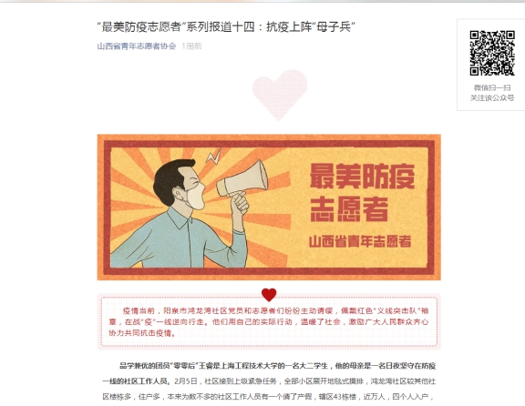 王睿同学表示,“通过几天来的防疫志愿服务工作,深刻感受到母亲及众多社区人员的辛苦和艰难,自己也成长了许多,母亲是自己最好的榜样,能参加这次志愿服务工作,是值得珍藏一辈子的精神财富。”