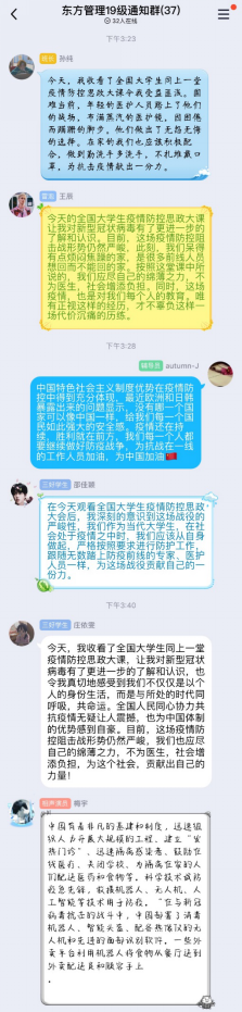 预科班的努尔夏提说道,虽然大学的第一个寒假的宁静被一场突如其来的新冠肺炎疫情打破,但看到在这场没有硝烟的战争中,无数英雄负重前行,身边各族有担当的青年主动到社区报到,踊跃投身在抗击疫情的各条战线,他想这就是团结的中国青年,也是自己学习的榜样!学习了今天的思政大课,他更加明白“这场疫情让我这位少数民族预科班的员工更加热爱我的祖国,我也希望自己早日成才,在祖国需要时能勇敢站出来,献出自己的力量!在病毒面前没有旁观者。我们要一起加油!愿春暖花开,万事无碍!”