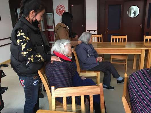 中午各志愿者集合完毕后,由志愿者部成员带领乘坐公共汽车前往敬老院。到达敬老院后,志愿者们立即与老人们欢快地聊起来了。虽然来自全国各地的志愿者难以听懂老人们所说的上海方言,但还是尽力靠近老人努力听清他们的话,附和他们的话,并试着用手语或放慢语速的方式让老人明白自己的意思。此外,志愿者们还为老人按摩捶背,使用手机的功能与老人做游戏,为老人播放老歌,与老人一起拍照留念。每名志愿者都十分热情,都努力与老人沟通聊天,希望老人能开心起来,温暖起来。志愿者们的努力没有白费,敬老院的老人们很喜欢志愿者的青春开朗,整个大厅里洋溢着温馨和谐的气氛。老人们微笑的脸庞和紧握着志愿者的手,是对志愿者们发自内心的认可。