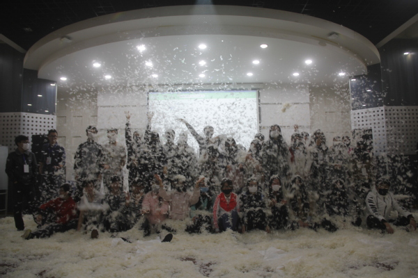 有趣暖心的小游戏之后,今日的主题“枕头大战”就正式开始了。还未等主持人说游戏开始,同学们就迫不及待地争抢起在四周摆放整齐的枕头并开始“战斗”,80多个枕头在一下下的击打中很快裂了开来,羽毛四溅。活动中,同学们或“恩怨私了”,或“群起攻之”,一时间羽毛漫天飘舞,奔跑中的身影随处可见。击打声,呼叫声,求救声,大笑声,声声入耳,此时或许你还在朝某人扔着枕头,下一刻可能就被身后的人袭击。在这个战场上,可以说没有永远的战友,有的只有一言不合就开打的“神队友”。平日里不苟言笑的高冷男孩瞬间变成了最活跃的杀手,最后被一群人追着打;最文静的女孩最后也不再矜持,放开身心沉浸在羽毛的海洋中。大家笑着,跑着,打闹着,漫天的羽毛像雪花一样,好像所有的烦恼在那一刻都消失不见了。在欢声笑语之中,活动接近尾声。此时,主持人邀请所有参与活动的同学一起拍了一张合影,照片中的大家笑容满面,四周羽毛飞舞,所有人都漫游在羽毛的海洋之中,其乐无穷。